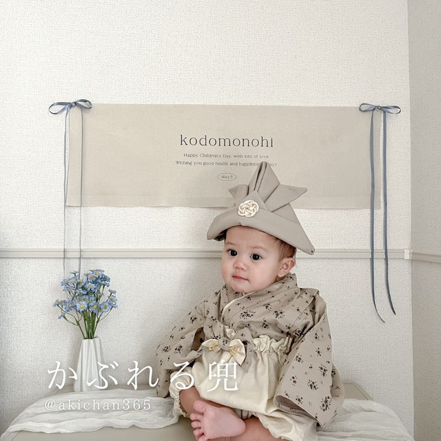 端午の節句の記念写真を、上品に、特別に。 淡い和色で仕上げた 「かぶれる兜」 です ふんわりと光をまとったような生地に、 中央には 水引飾り を添えて、凛とした華やかさをプラス。 派手すぎないカラーなので、 ナチュラルな雰囲気の撮影や淡色インテリアにもよく馴染みます 赤ちゃんの初節句はもちろん、 わんちゃん・ねこちゃんの節句フォトにもおすすめ。 かぶるだけで“端午の節句らしい一枚”が簡単に完成します✨ 【サイズ】 ★ウルトラビック/幅33cm、高さ17cm 大きめの赤ちゃんからキッズにおすすめ! 【水引】(無料) オプションより選択をお願いします ※選択がない場合は梅結び(ゴールド)になります 【あご紐】(+100円〜) あごゴムの場合は兜の内側に取付用の輪っかを縫い付けます。到着後ご自身でお好きな長さにカットして括り付けてください。 ★ゴム/40cm (ホワイト、ブラック、イエローより選択可) ★リボン/50cm×2本 (ベージュ、シルバー、ホワイト、ピンクより選択可) 【洗濯について】 洗濯不可