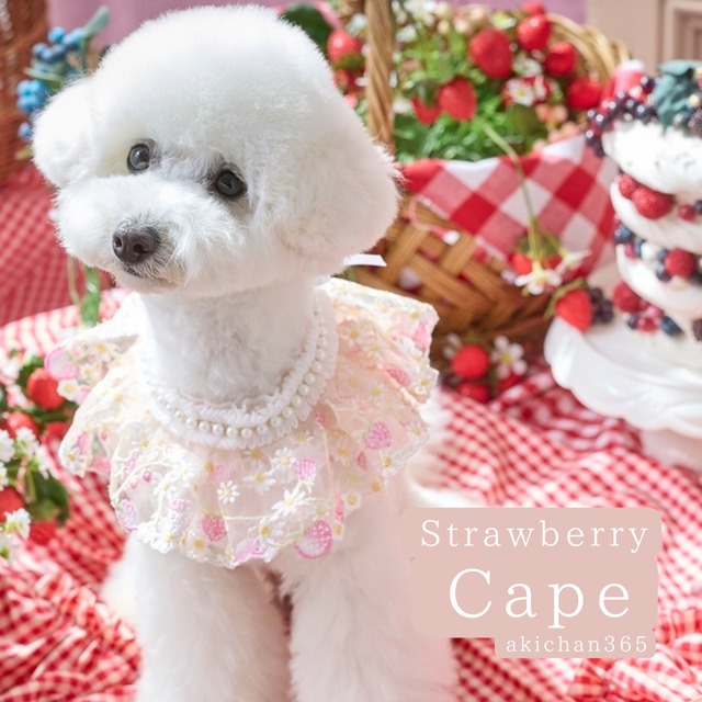 いちごレースのふんわりケープ|パール付き首飾り|犬 猫 ペット用|記念日、バレンタイン、誕生日