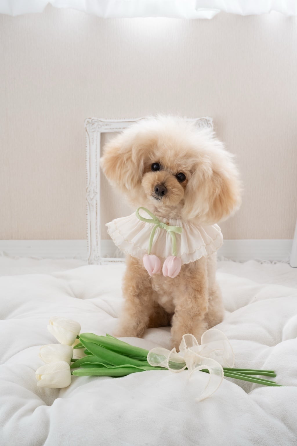 ふんわり重ねたパステルチュールに、 繊細なレースとパールをあしらった 華やかなペット用ケープです。 まるで小さなドレスのようなシルエット。 つけるだけで一気に特別な日の装いに仕上がります。 首元はやわらかなレース仕様。 軽量で負担が少なく、小型犬・猫ちゃんにもおすすめです。 ⸻ ▷ カラー ・パステルピンク ・ミントグリーン 春の撮影や、ひな祭り、 お誕生日フォト、うちの子記念日にもぴったり。 別売りのオーガンジーリボンと合わせると さらに華やかなコーディネートをお楽しみいただけます。 ⸻ ▷ こんなシーンに ✔ 犬用つけ襟 ✔ 猫用ケープ ✔ 誕生日撮影 ✔ ひな祭り ✔ ハーフバースデー ✔ トリミング後フォト ✔ ペットフォト小物 ⸻ 【サイズ】 ケープ丈/9cm 【素材】 チュール/レース/パール装飾 ※強い力を加えると破損の原因になります。 ※誤飲防止のため必ず飼い主様の目の届く範囲でご使用ください。