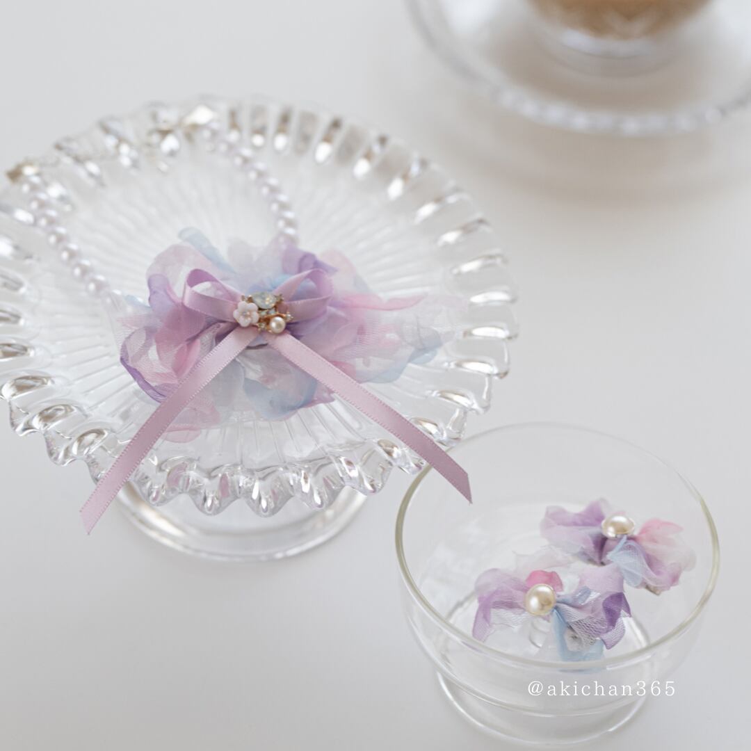 紫陽花をイメージしたリボン付きネックレスとヘッドリボン(2つ)のセットです。