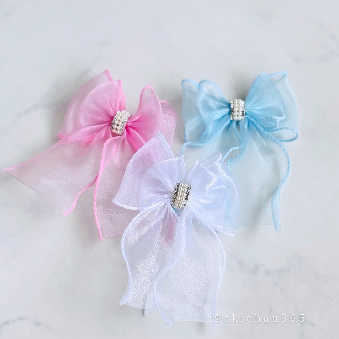 きらきら輝くビジュー付きの大きなオーガンジーリボンが