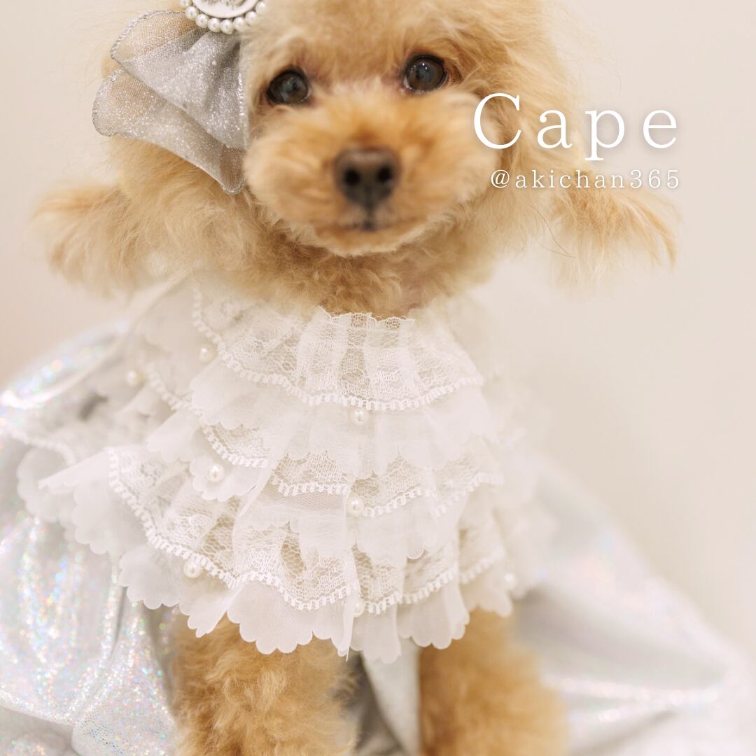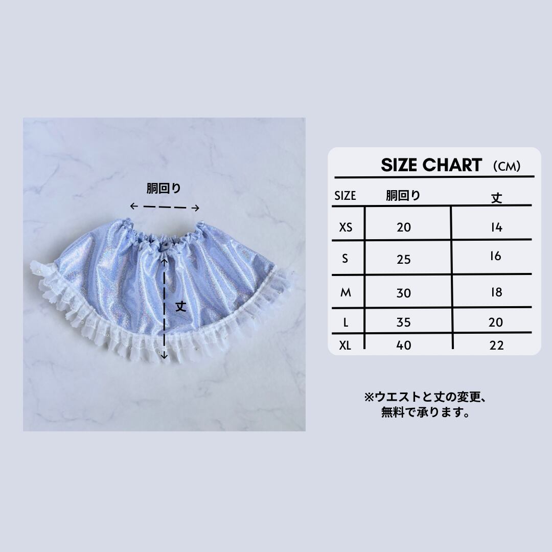 ※ケープとスカート、パニエはご希望のサイズに合わせてオーダー可能です。購入時に首周りと胴回り(前足のすぐ後ろ)、着丈(首輪からしっぽの付け根まで)のサイズを備考欄へお願いします。