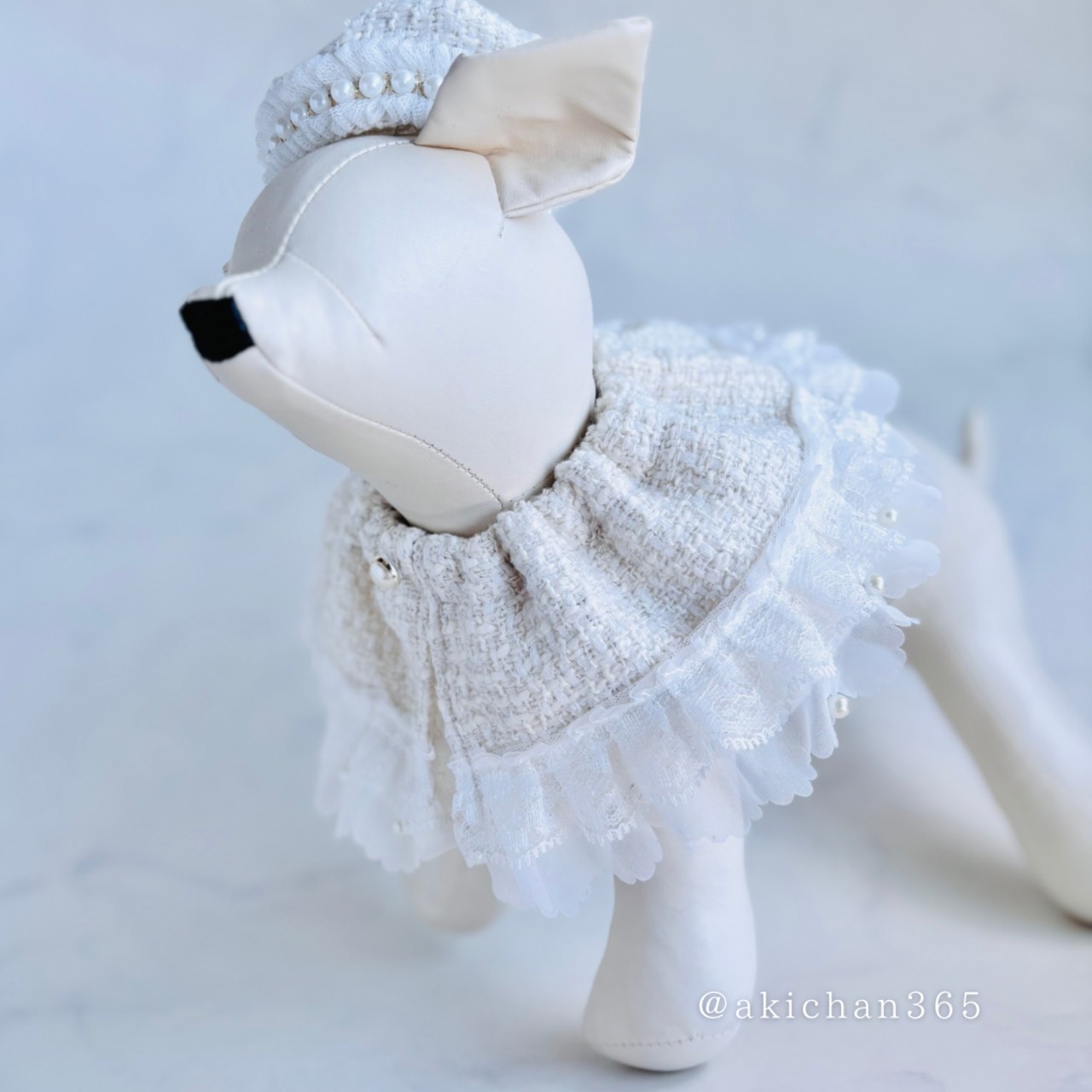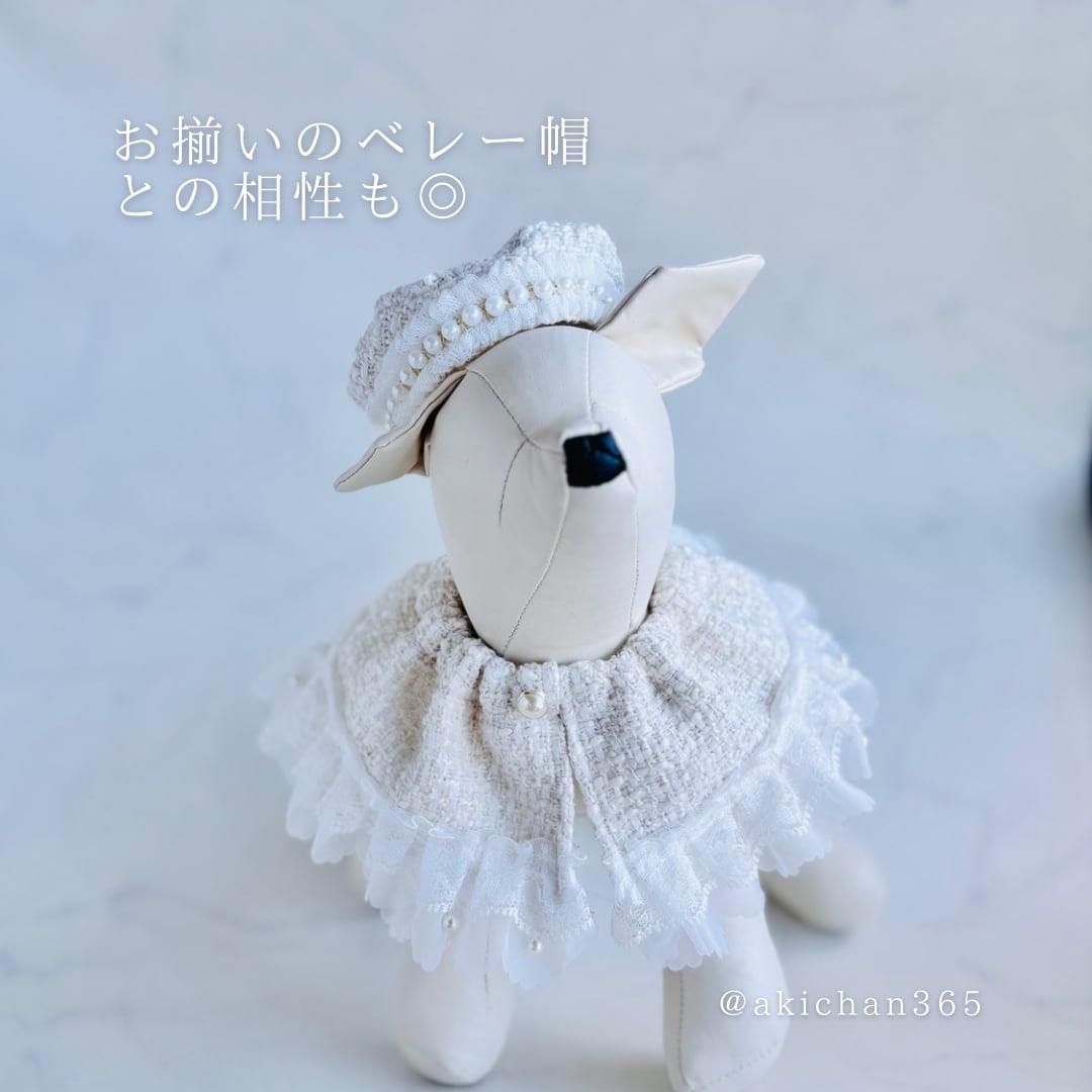 パール付きホワイトツイードのフリルケープ(犬用、猫用、つけ襟、スタイ)