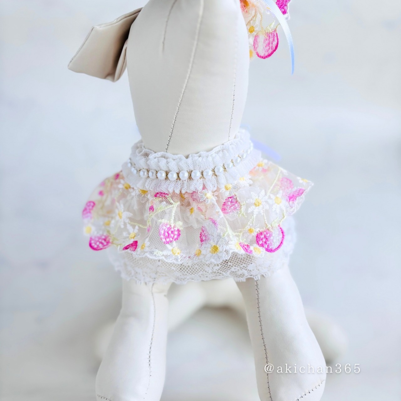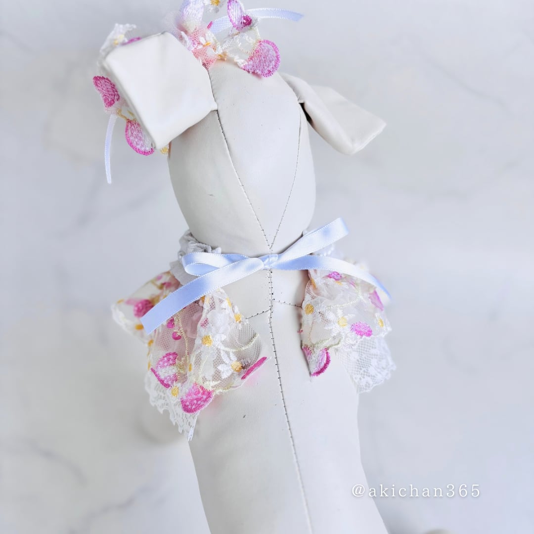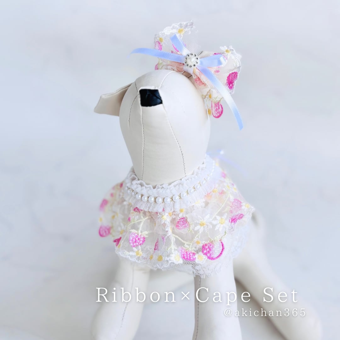 いちごレースのふんわりケープ&リボンセット|パール付き首飾り|犬 猫 ペット用|記念日、バレンタイン、誕生日