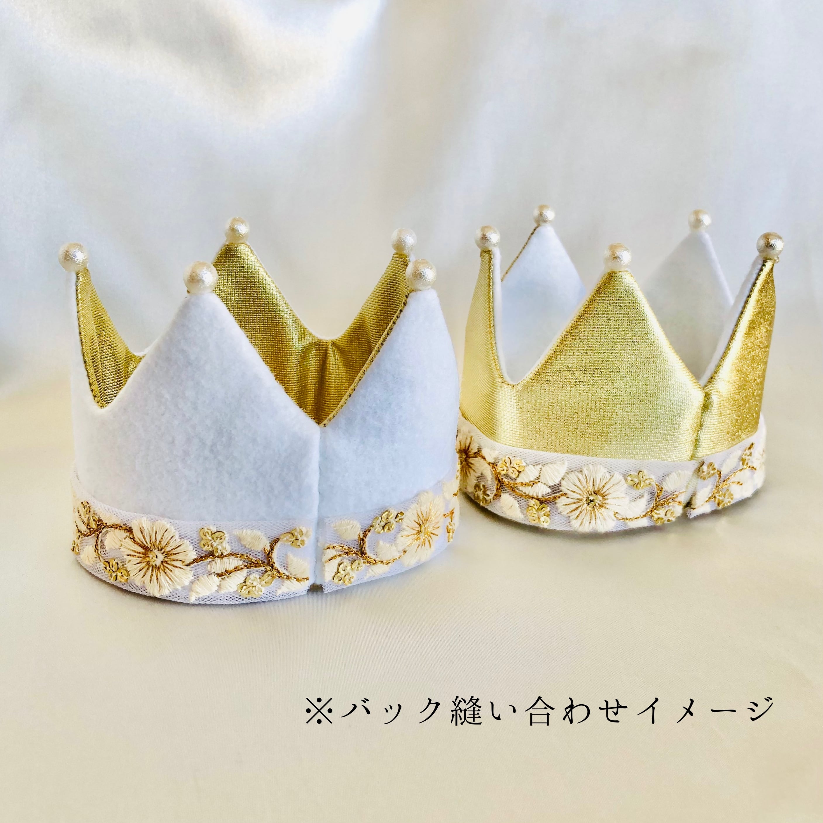 ベビークラウン 淡ゴールド×ホワイト 刺繍リボンバースデークラウン、ひな祭り、100日、ハーフバースデー 、誕生日、王冠、1歳、ピンク、花、かわいい、女の子、ニューボーンフォト】