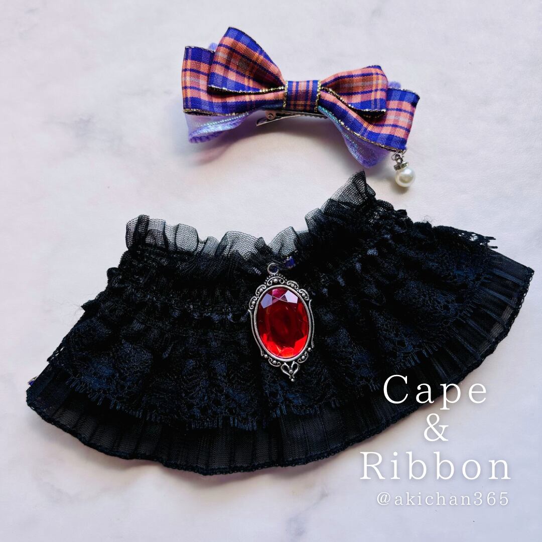 ハロウィンケープ+リボン(ケープ、つけ襟、スタイ、ヘアクリップ、犬、猫)